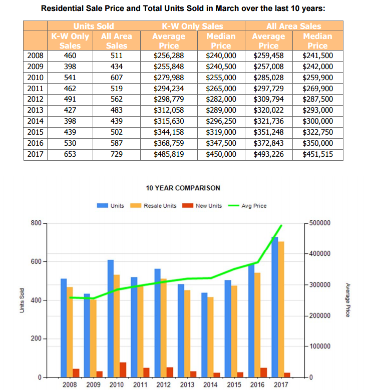 K-W 地产协会(KWAR)发布2017年3月份K-W及周边地区地产报告,3月份通过MLS共销售729套住宅房,比2016年同比增加24.2%, 均价达到49.32万, 同比增长32.3% 。